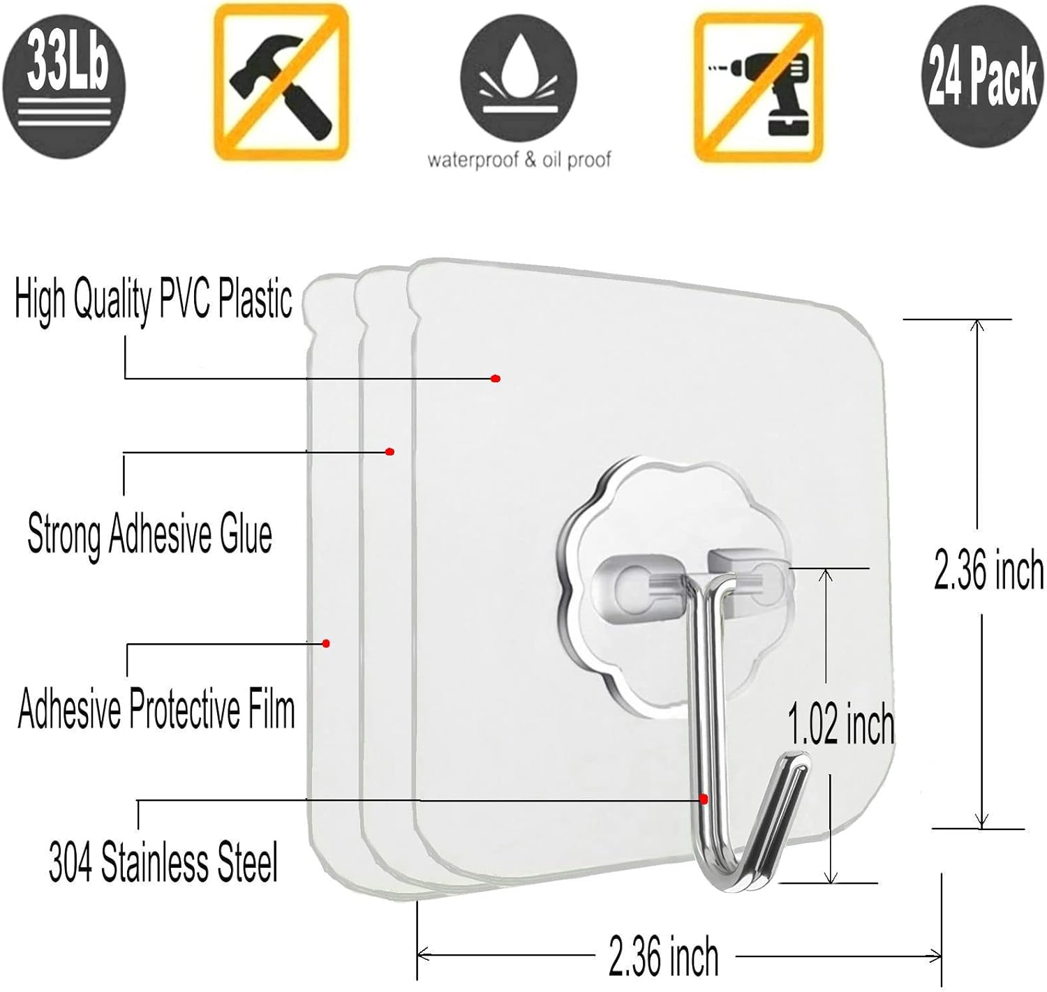 24 Pack Heavy Duty Self Adhesive Hooks - 33lb Max, Transparent, Waterproof