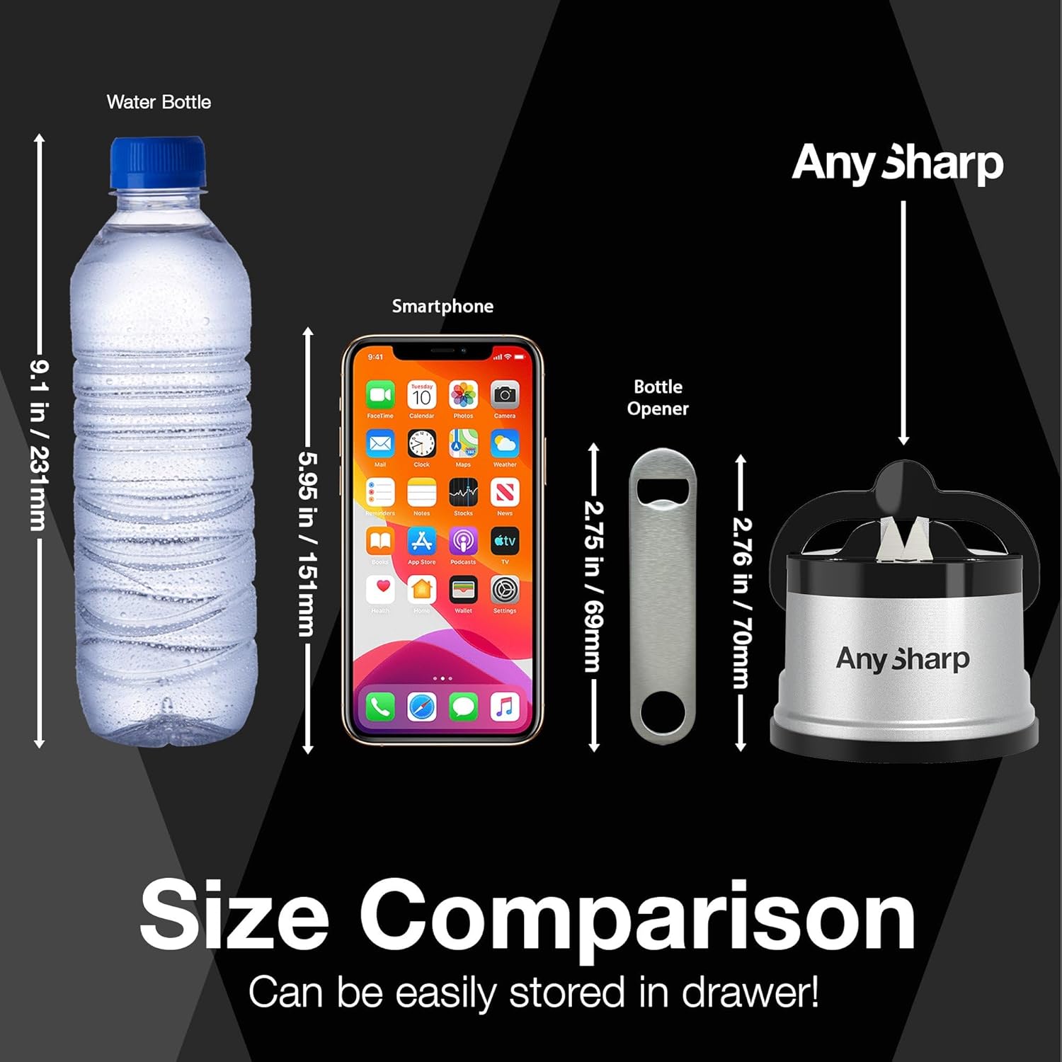 - 📏 Small but mighty! The AnySharp Knife Sharpener boasts a compact size, fitting easily into your drawer; Despite its small footprint, it delivers big results, making it an essential addition to your kitchen; Plus, its sleek silver color and plastic body add a touch of modernity to any kitchen decor