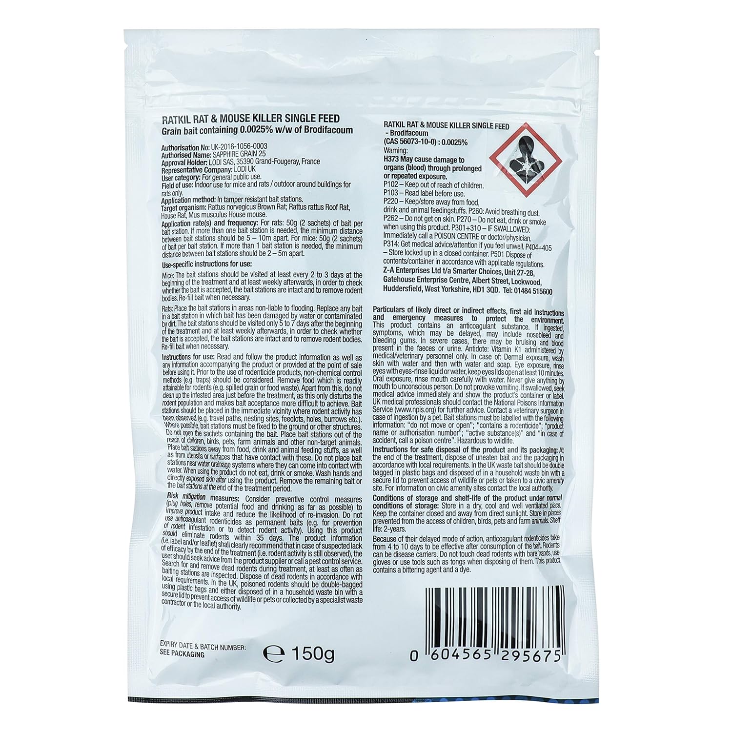 - Single feed poison bait - This listing contains 1 packet of 6x25g sachets (Brodifacoum 0.0025% w/w). Each sachet contains cereals which are highly attractive to Rodents. Only a single feed of Ratkil poison is needed to hit their lethal dose. A large rat or mouse infestation can be controlled effectively within a couple of days.
